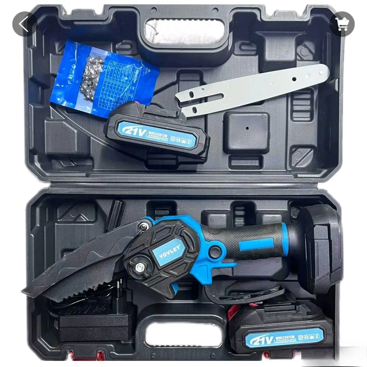 2 baterije, punjač, rezervnu vodilicu i lanac, alat za održavanje i praktičan kofer.
