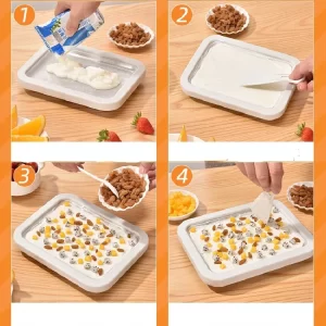 Aparat se koristi bez električne energije. Dovoljno je da ga stavite u zamrzivač na najmanje 10 sati, a zatim dodate svoje omiljene sastojke – voće, čokoladu, mleko, jogurt ili biljne alternative. Smesa se izliva direktno na rashlađenu ploču, izravnava i oblikuje uz pomoć dvostrukih špatula koje dolaze u paketu.