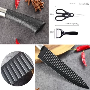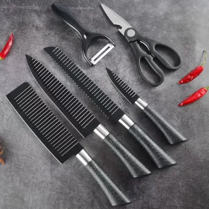 Kuhinjski set noževa (6 komada) izrađen je od visokokvalitetnog nerđajućeg čelika, sa oštrim sečivima koja omogućavaju lako i precizno sečenje. Ergonomski dizajnirane drške pružaju siguran i udoban hvat, čineći svaku pripremu hrane prijatnijom.