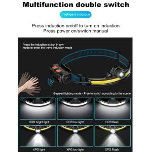 Otkrijte XPG + COB LED čeonu lampu sa senzorom pokreta, USB punjenjem i snažnim svetlom. Idealna za kampovanje, ribolov i planinarenje. Podesiv fokus i indikator baterije za maksimalnu praktičnost