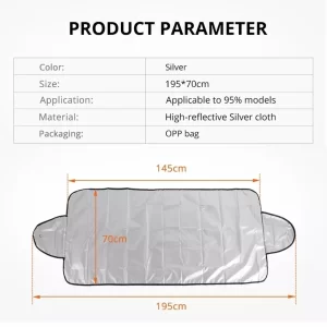 Ova zaštita je izrađena od aluminijumskog filma, sa jednom stranom obojenom u crno, dok je druga strana srebrna. Ovaj materijal je izuzetno otporan i prilagođen za dugotrajnu upotrebu, omogućavajući odličnu refleksiju svetlosti tokom leta i zadržavanje toplote tokom zime. Dimenzije proizvoda dolaze u dve varijante, omogućavajući vam da izaberete onu koja najbolje odgovara vašem vozilu. Prva opcija, dimenzija 146×70 cm, namenjena je za pokrivanje samo prednjeg vetrobranskog stakla, dok druga, veća verzija od 190×70 cm, uključuje i dodatne uši za pokrivanje retrovizora, čime se osigurava potpuna zaštita automobila.